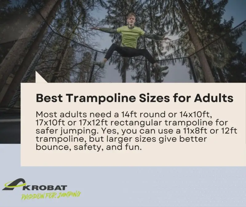 Most adults need a 14ft round or 14x10ft, 17x10ft or 17x12ft rectangular trampoline for safer jumping. Yes, you can use a 11x8ft or 12ft trampoline, but larger sizes give better bounce, safety, and fun. Learn how to choose the right size, what weight limits to check, and tips for garden space, safety, and durability.